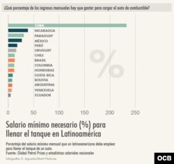 Llenar el tanque de gasolina en Cuba tiene el precio más alto de toda Latinoamérica. Sólo Uruguay y Argentina la superan en la región en cuanto al precio del litro de combustible, aunque de acuerdo al salario mínimo en cada nación, los cubanos son los que más esfuerzo económico deben realizar.