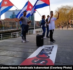 La Asociación Cubano-Vasca Demokrazia Kubarentzat se manifestó este lunes frente al Ayuntamiento de Bilbao, en España, para apoyar a los cubanos que protestan en Cuba.
